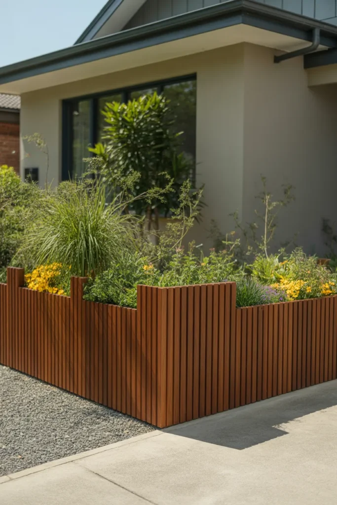 Tall timber panels create a bold and eye-catching garden edging solution. The added height helps clearly define planting areas near the front of the house. This design works beautifully for larger flower beds with layered plants. It adds privacy, structure, and strong visual impact to the landscape.