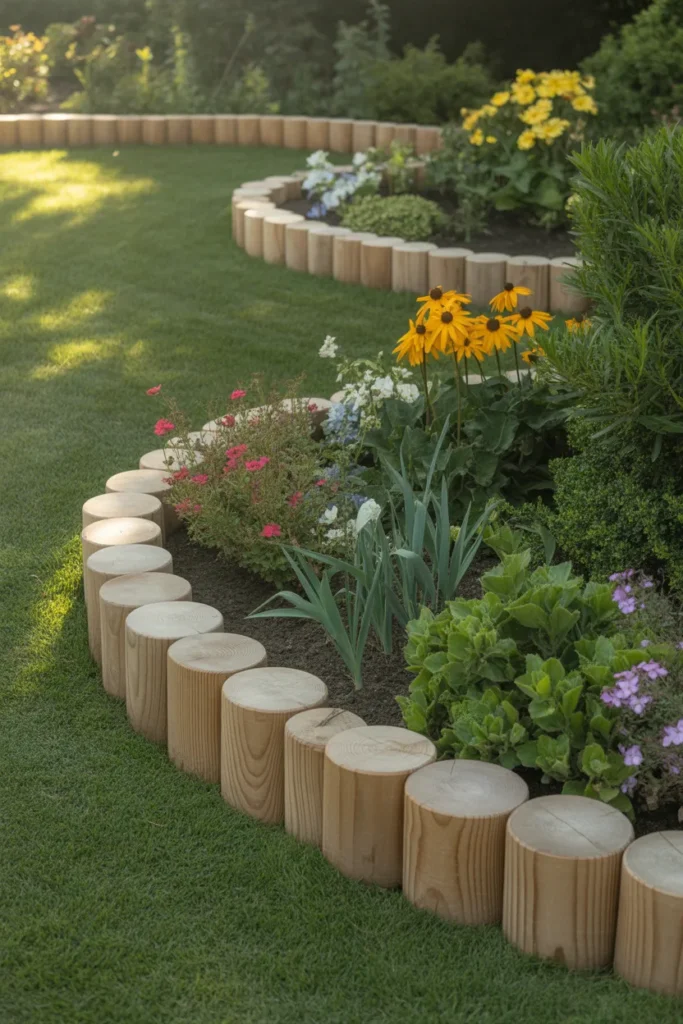 Half-buried timber edging provides a subtle yet effective boundary. The partially exposed wood blends naturally with grass and soil. This option is perfect for homeowners who prefer understated landscaping. It maintains structure while keeping the design simple.