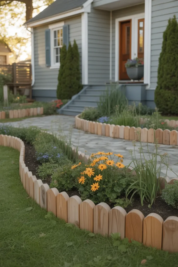 Scalloped wooden edging introduces a playful and decorative element. The curved pattern adds visual movement along flower beds. This style complements traditional and cottage-style homes beautifully. It frames plants with charm and personality.
