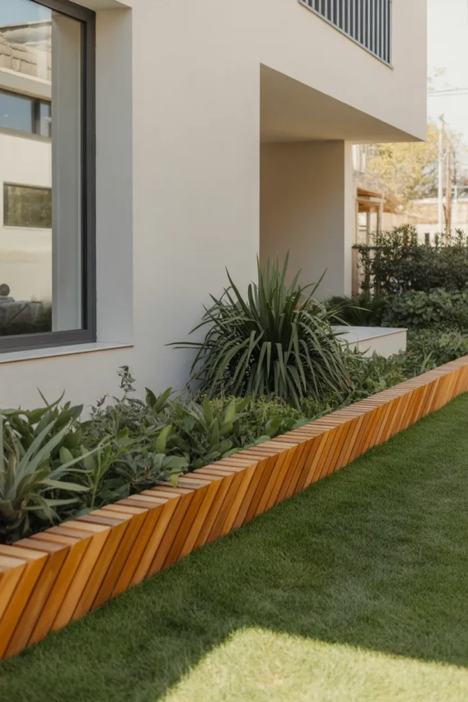 Flush wood edging sits level with the lawn for a clean appearance. The subtle border keeps attention focused on plants and flowers. This option is ideal for contemporary homes with simple landscaping. It maintains neat lines without overpowering the design.