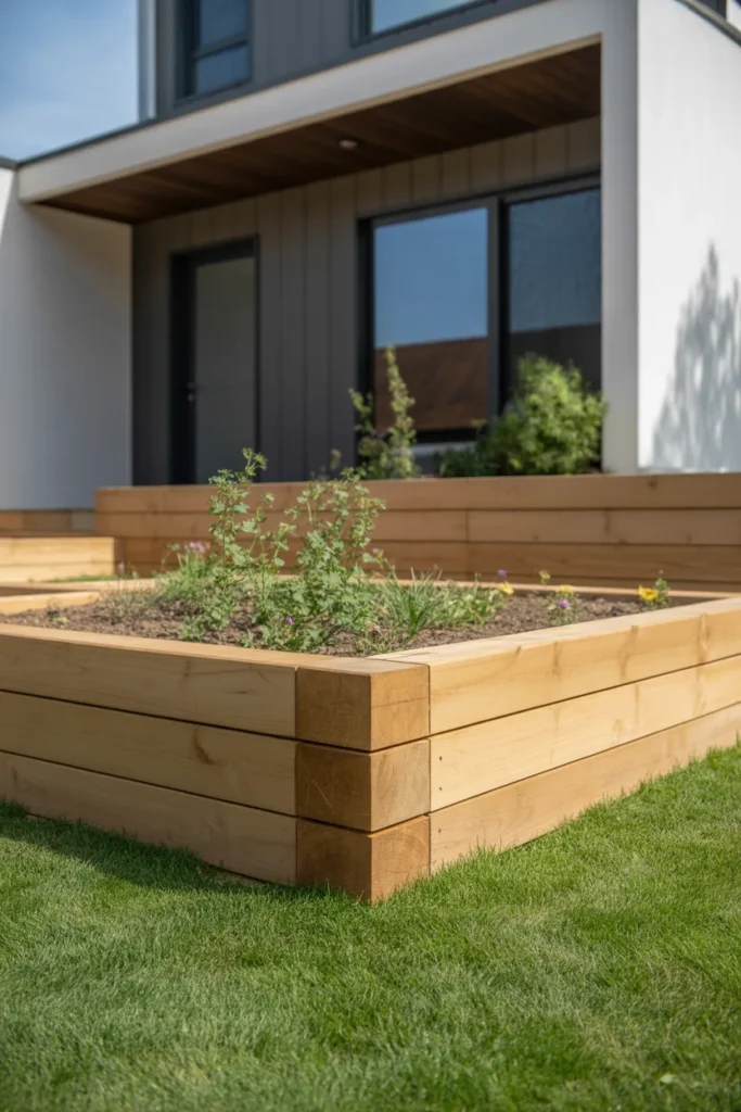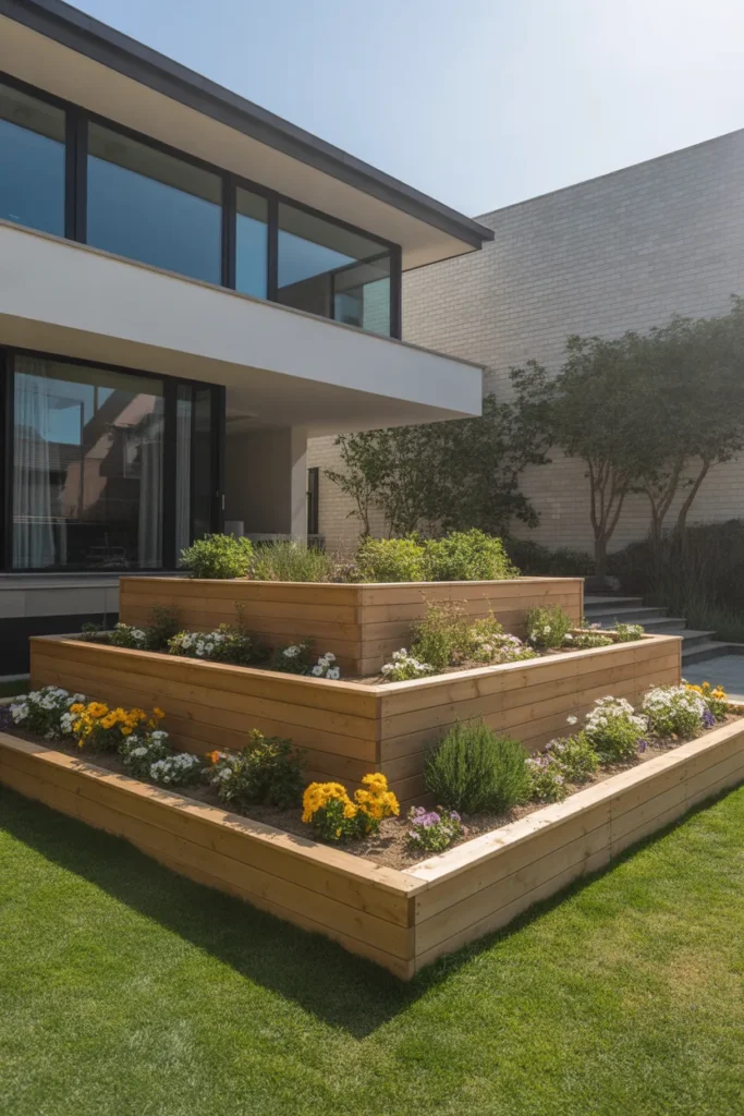 Multi-level wooden frames create dimension in the landscape. The tiered design highlights different plant heights effectively. This style works especially well in larger front yards. It adds architectural structure while keeping plants neatly framed.