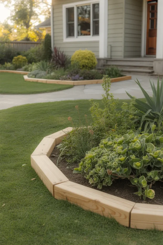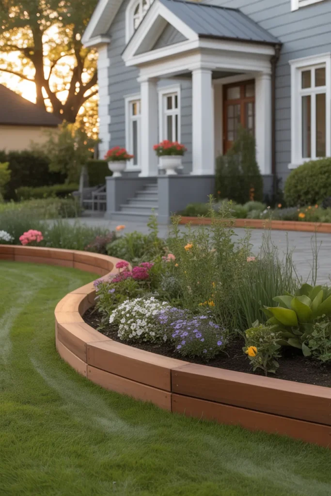 Curved wooden edging creates gentle transitions between lawn and flower beds. The flowing lines soften the overall look of the front yard. This design works especially well in landscapes with rounded planting areas. It makes the entrance feel more dynamic and visually appealing.