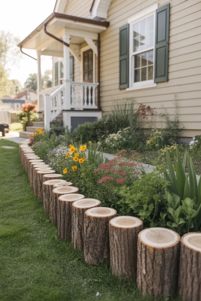 Wooden log slices bring a playful and natural touch to your yard. The circular shapes create a unique pattern that frames plants attractively. This style pairs wonderfully with colorful seasonal flowers. It gives the front of your home a warm and inviting personality.