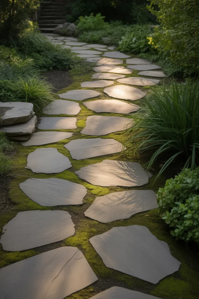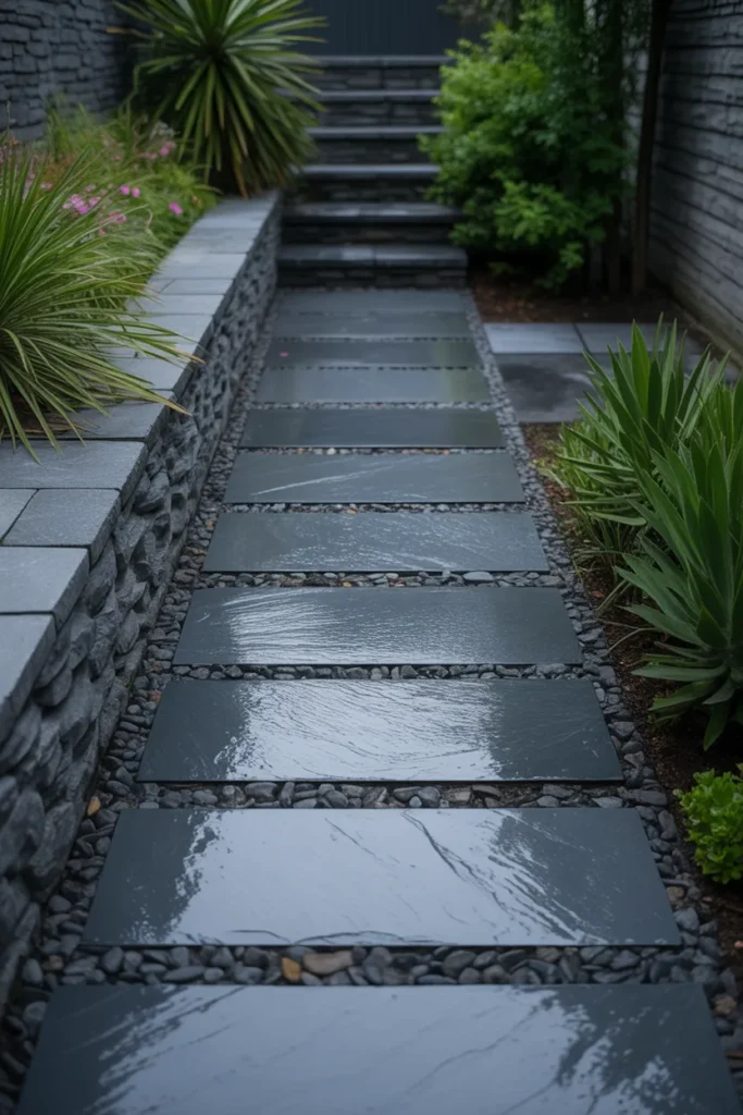 Slate tiles bring elegance and sophistication to your garden. Their dark tones create a striking contrast with greenery. They are durable and perfect for modern outdoor spaces. This pathway style feels clean, polished, and high-end.