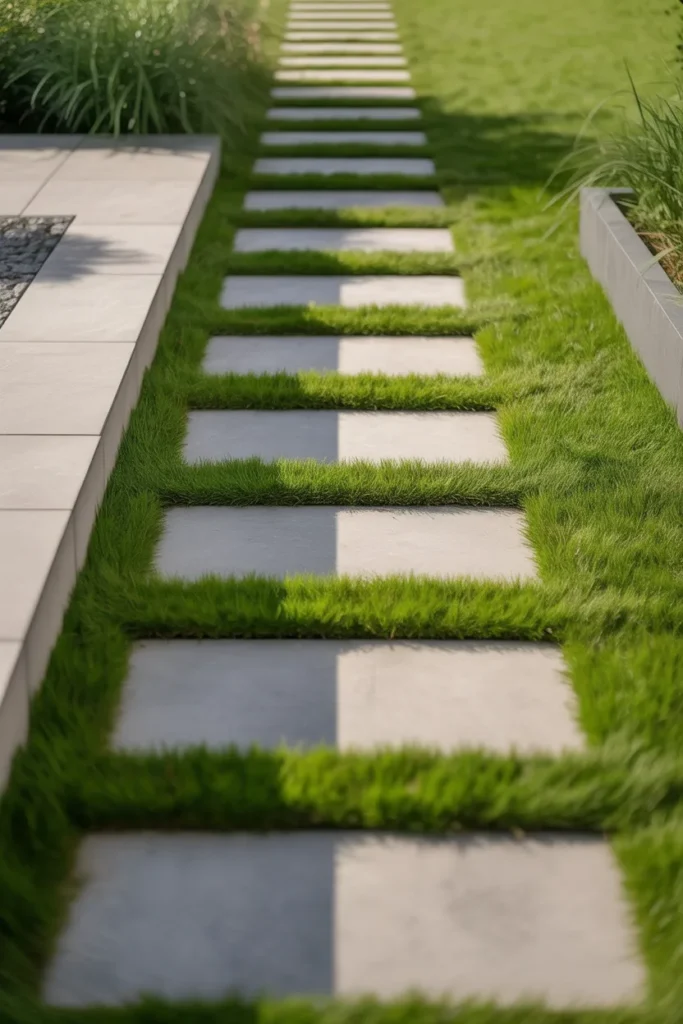 Grass joint pathways combine structure with nature perfectly. Concrete or stone slabs are placed with spaces for grass to grow in between. This creates a fresh, breathable design that feels open and green. It’s ideal for modern gardens looking to stay connected with nature.