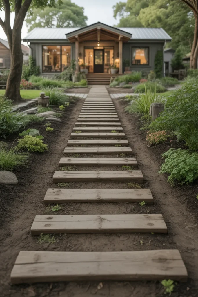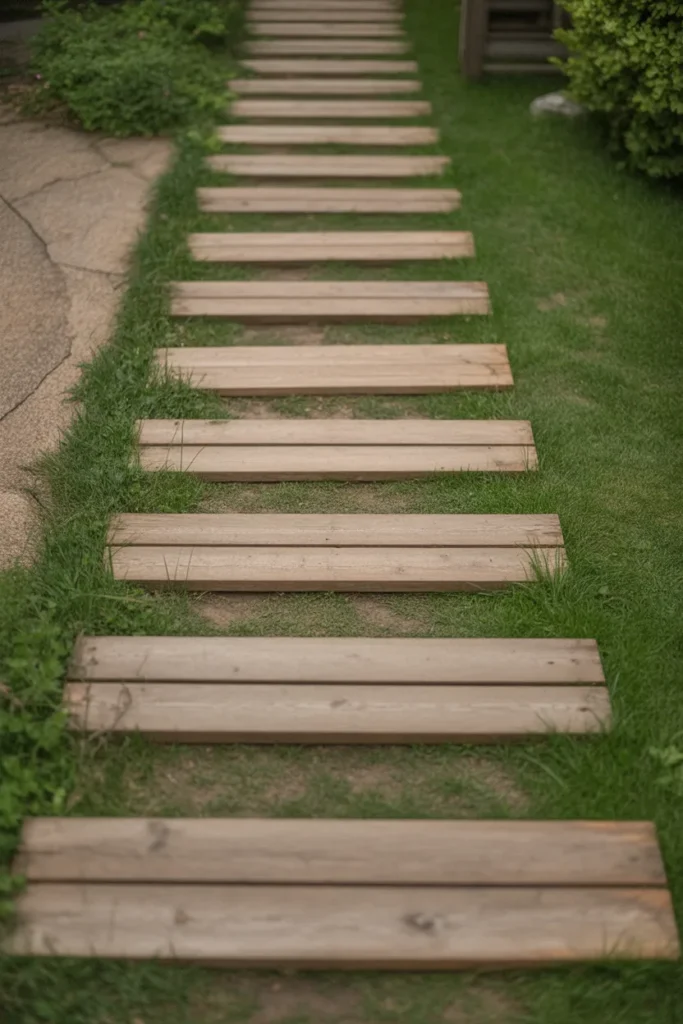 Wood planks offer a clean and simple pathway design. Placing them evenly across your garden creates a modern yet natural look. The warm tones of wood complement any landscape. It’s an easy DIY project that adds structure without feeling heavy.