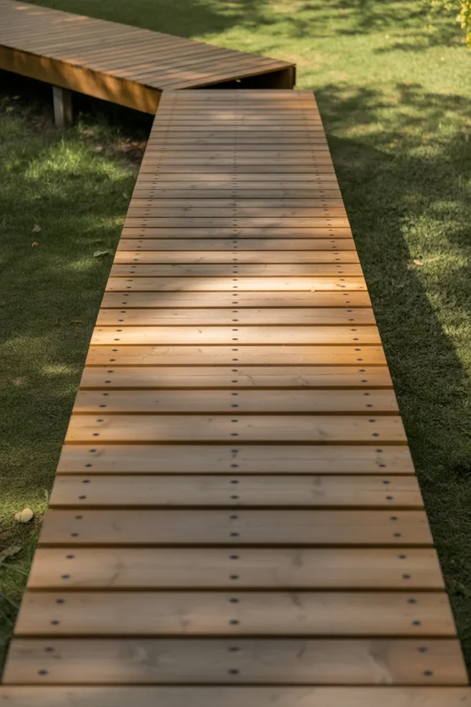 A raised wooden boardwalk adds dimension and uniqueness to your garden. It works especially well in uneven or damp areas. The elevated design keeps the path clean and dry. It also creates a stylish and inviting walkway through your outdoor space.