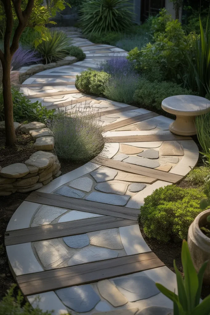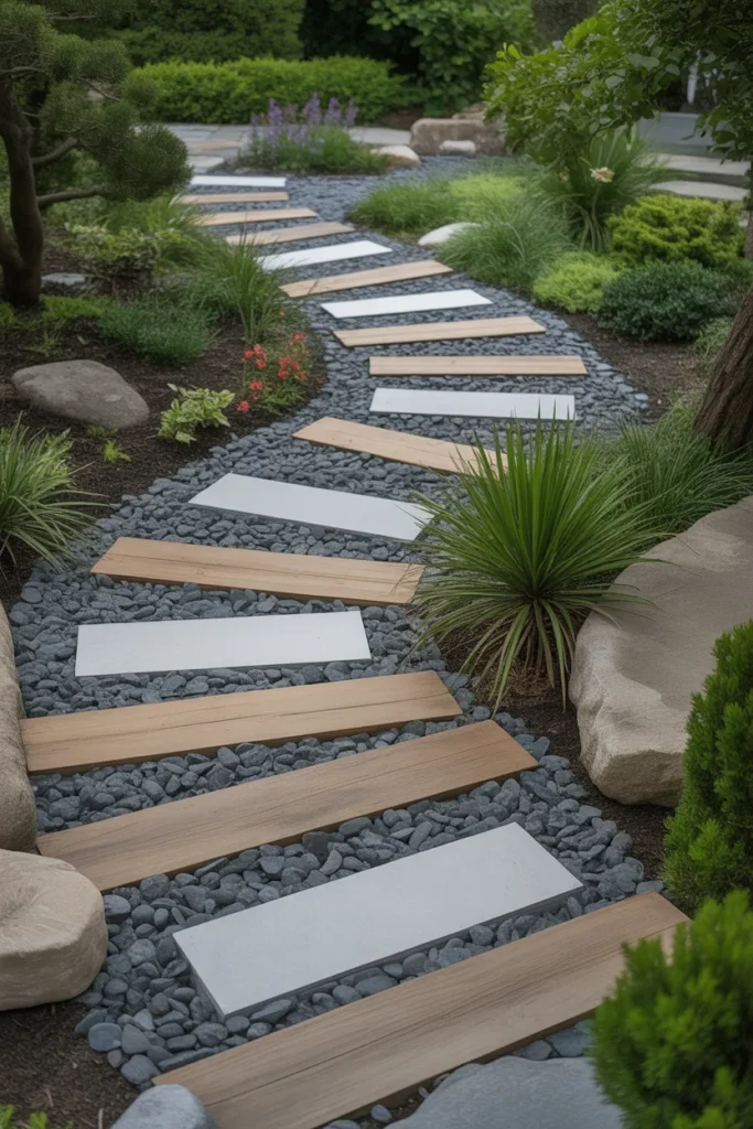 Combining different materials creates a unique and eye-catching pathway. You can mix wood, stone, and gravel for contrast and texture. This approach allows you to get creative with your design. It results in a personalized and visually rich garden path.