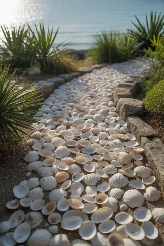 Shell pathways bring a light, coastal vibe to your garden. Crushed shells create a bright and textured surface that feels fresh and unique. They are easy to spread and naturally compact over time. This style is perfect for beach-inspired outdoor spaces.
