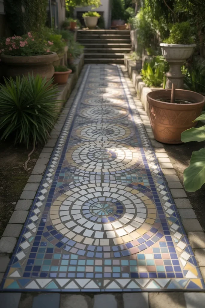 Mosaic tile paths allow you to express creativity through design. Using broken tiles, you can form beautiful patterns and unique layouts. This pathway becomes a true focal point in your garden. It’s perfect for adding color and personality.