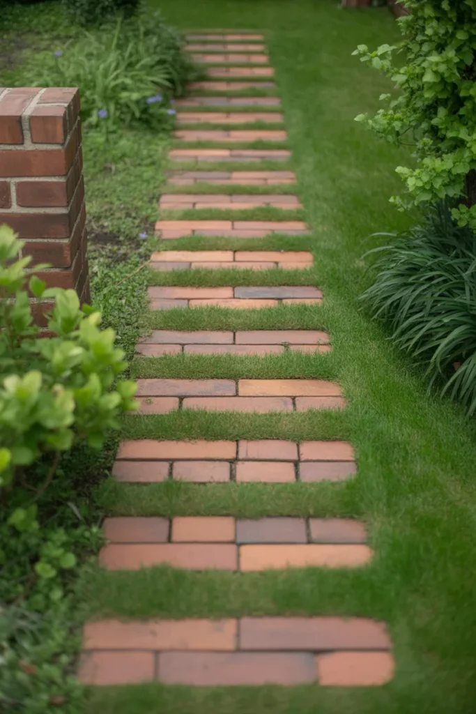 Combining brick with grass softens the look of a traditional pathway. The greenery between bricks adds freshness and contrast. It feels both structured and natural at the same time. This design is perfect for balanced outdoor aesthetics.