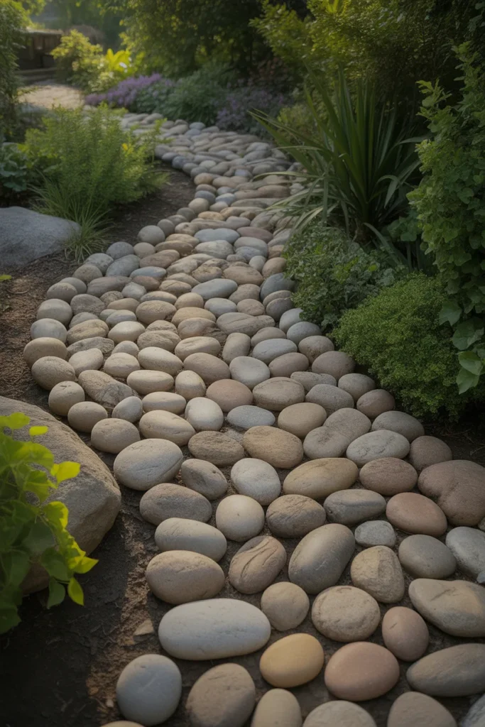 River rock pathways create a naturally polished and soothing look. The smooth stones are comfortable to walk on and blend beautifully with plants. This style works especially well in water-inspired or zen gardens. It brings a calm and organic feel to your outdoor space.