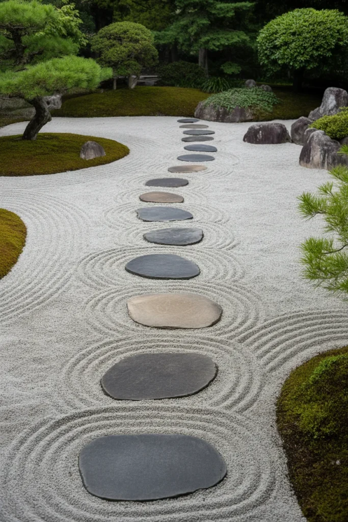 Zen pathways focus on simplicity and balance. Clean stone placements and gravel designs create a peaceful environment. Every element is intentionally minimal and calming. This design is perfect for relaxation and meditation spaces.