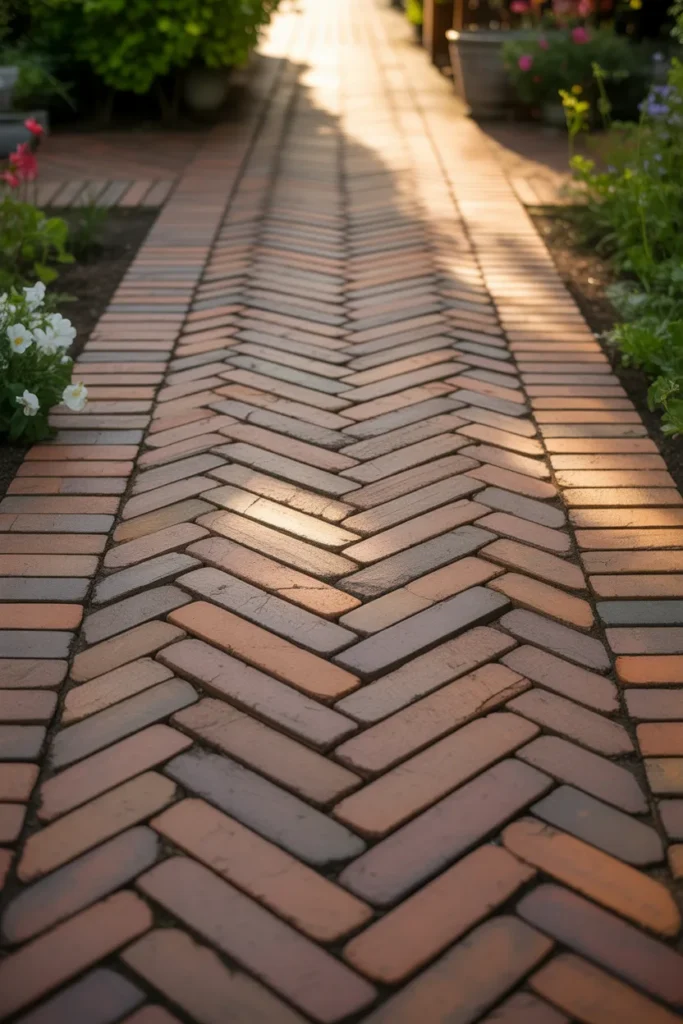 The herringbone brick pattern adds strength and elegance to your walkway. It creates a visually dynamic surface that feels classic and refined. This design is highly durable and long-lasting. It’s perfect for traditional and structured gardens.