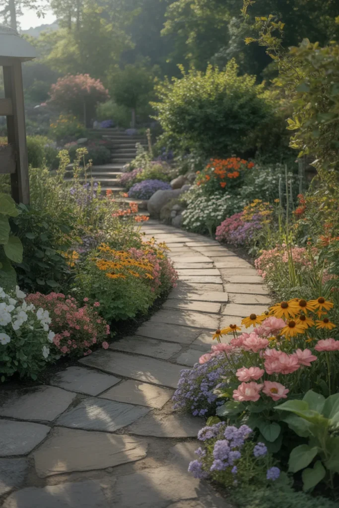 Flower borders instantly brighten any garden pathway. Surrounding your path with blooms adds color and fragrance. It creates a welcoming and enchanting atmosphere. This style works beautifully in cottage and romantic gardens.