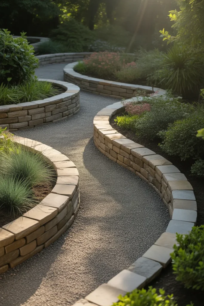 Raised stone borders give pathways a clean and defined structure. They help keep gravel or mulch neatly in place. This design improves both functionality and appearance. It adds a professional landscaping touch.