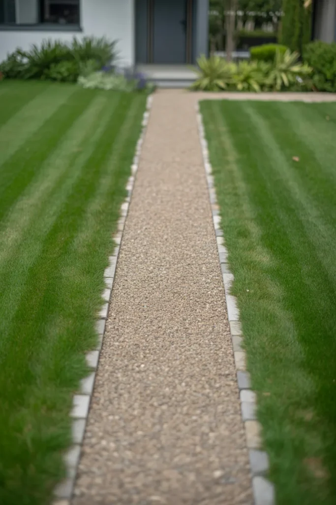 Minimalist gravel paths focus on simplicity and order. A narrow gravel strip creates a clean and modern aesthetic. This design works well in small or contemporary gardens. It offers beauty without clutter.