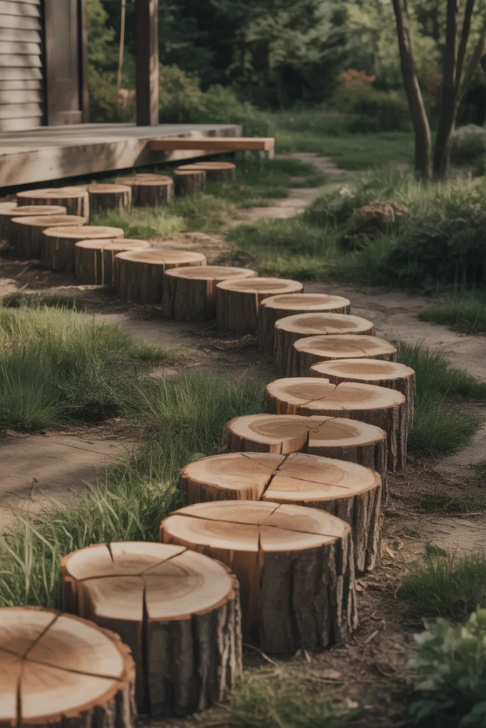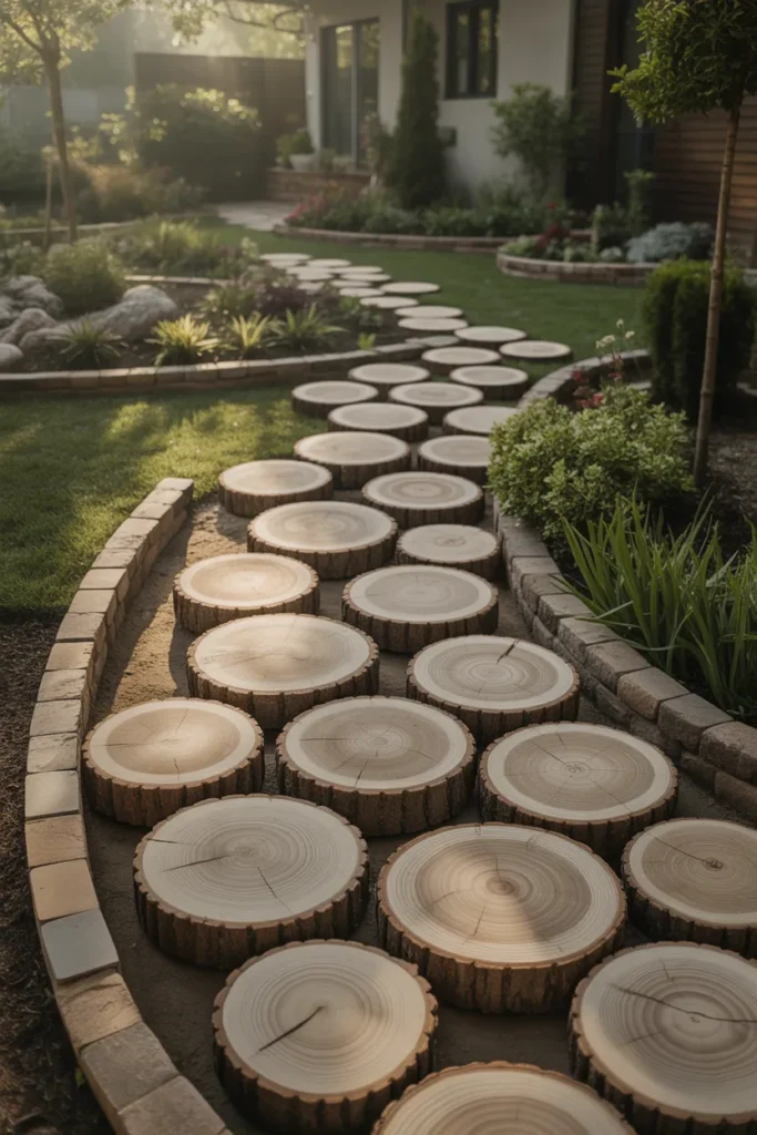 Wood slice pathways add a rustic and creative touch to your garden. Cut tree logs into even slices and place them along your path. This design blends seamlessly with natural surroundings. Sealing the wood helps extend its lifespan and keeps it looking fresh.