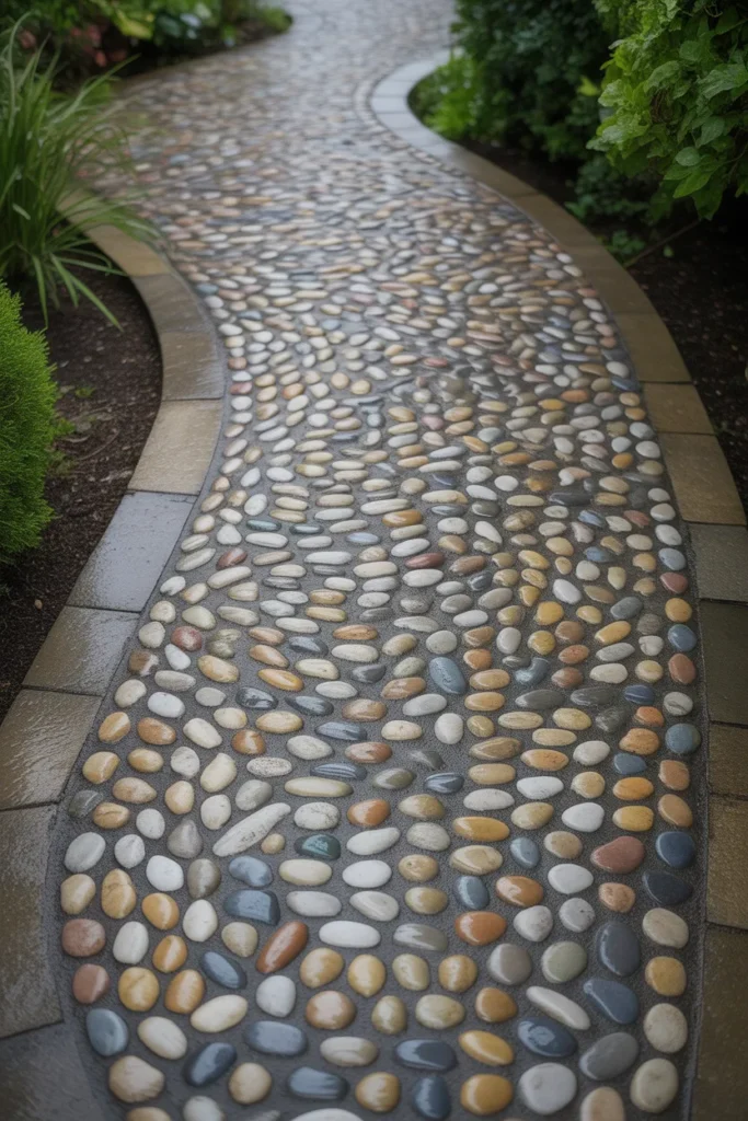 Using mixed-color pebbles creates a vibrant and decorative pathway. The blend of tones adds visual interest and depth. This style is easy to customize based on color preference. It’s perfect for creative and artistic gardens.