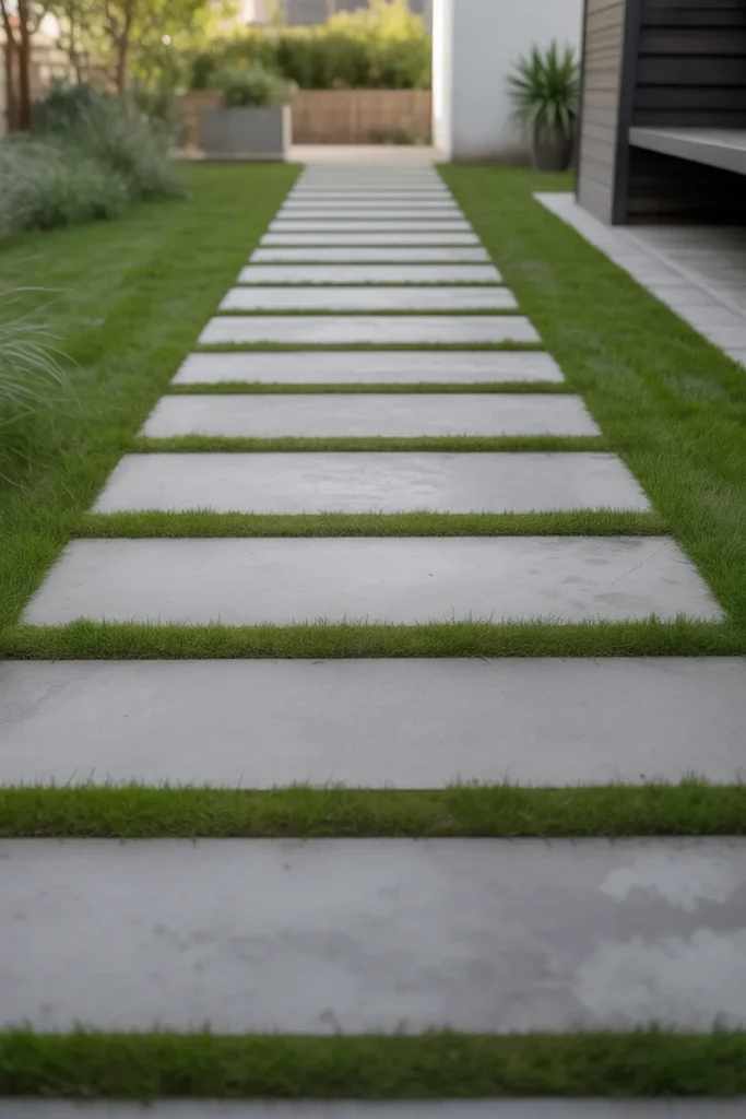 Concrete slabs offer a modern and minimalist pathway design. Place large slabs with equal spacing to create a clean and structured look. Grass or gravel between the slabs adds contrast and softness. This design works especially well in contemporary gardens.