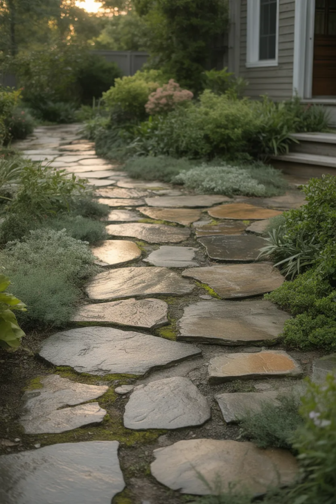 Flagstone pathways create a natural and timeless look in any garden. The irregular shapes of the stones make the path feel organic and relaxed. You can fill the gaps with moss or gravel for added charm. This design blends beautifully with plants and gives a serene outdoor vibe.