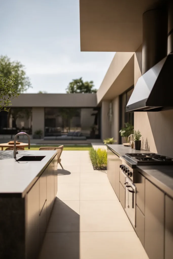 A modern minimalist outdoor kitchen focuses on clean lines, uncluttered space, and functional design. Neutral colors like white, grey, and black create a calm and stylish atmosphere. This setup is perfect for those who love simplicity while still enjoying outdoor entertaining. It keeps everything organized while offering a sophisticated summer gathering spot.
