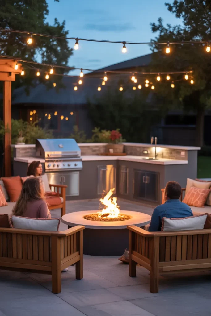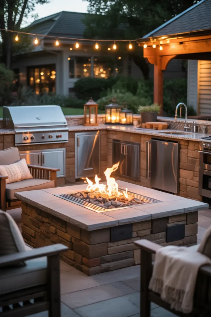A fire pit near your outdoor kitchen creates a perfect gathering spot after meals. Guests can relax, chat, and enjoy the warmth as the evening cools down. It adds a cozy and intimate vibe to your space. This setup is great for extending summer nights outdoors.