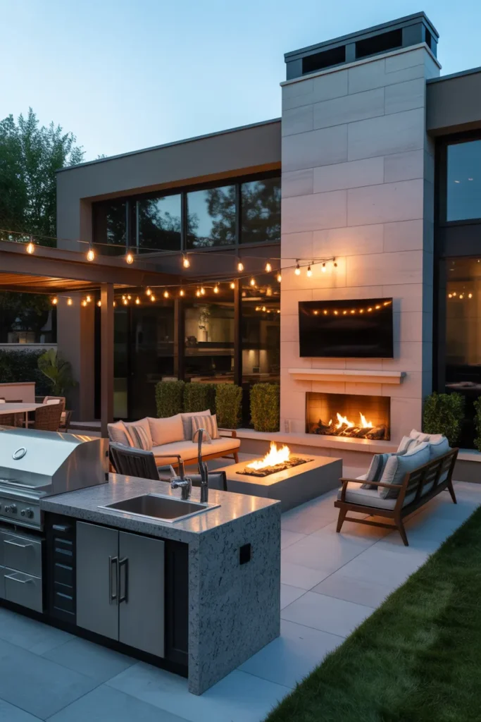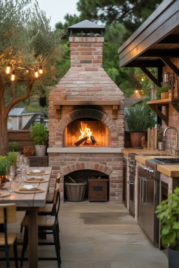 Adding a fireplace to your outdoor kitchen extends its usability into cooler evenings. It creates a cozy ambiance where guests can gather and relax. The combination of cooking and warmth makes it a perfect social hub. This design brings both comfort and elegance to summer nights.