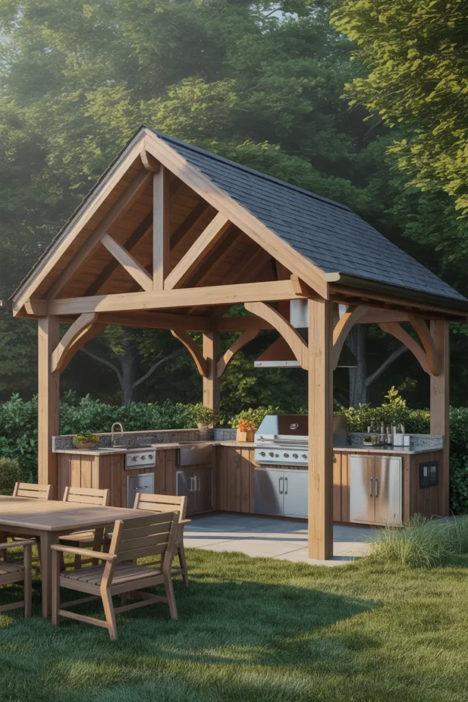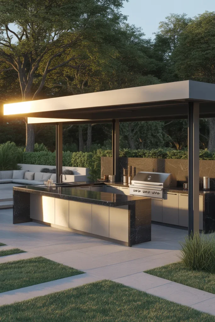 A covered pavilion protects your outdoor kitchen from sun and unexpected weather. It allows you to cook and entertain comfortably throughout the day. The structure also adds a sense of permanence and luxury to your backyard. It’s a great choice for frequent hosts who want reliability and style.