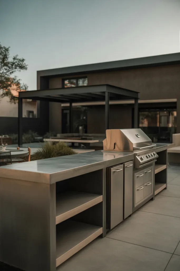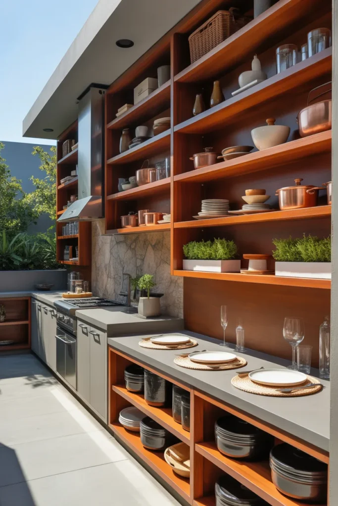 Open shelving adds both style and practicality to your outdoor kitchen. It allows easy access to cooking essentials while displaying decorative items. This design keeps everything within reach without feeling cluttered. It’s a great way to blend functionality with visual appeal.