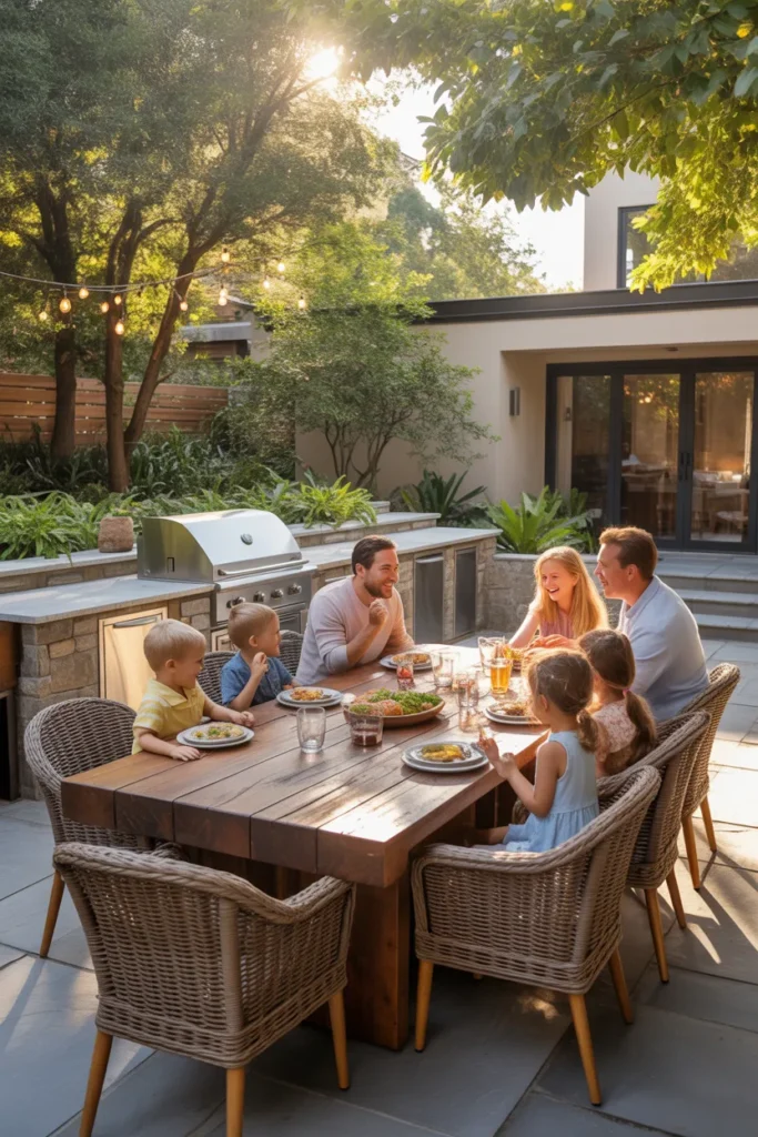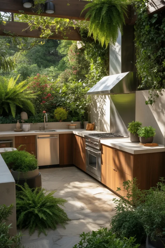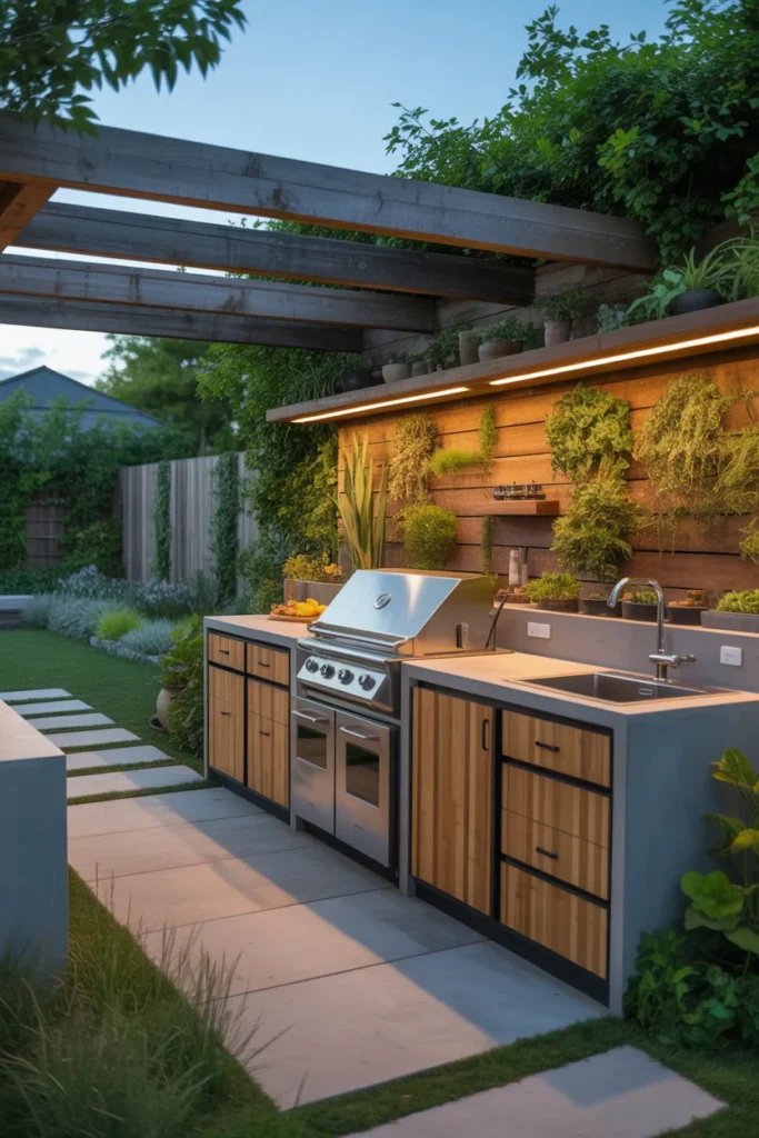 An eco-friendly outdoor kitchen focuses on sustainability and energy efficiency. Using recycled materials and solar lighting reduces environmental impact. It’s a thoughtful way to enjoy outdoor living while being responsible. This design is perfect for environmentally conscious homeowners.