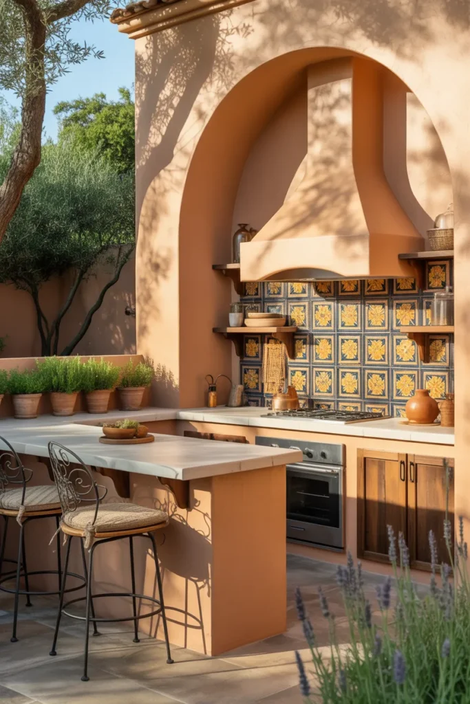 Mediterranean outdoor kitchens bring a warm and inviting aesthetic with colorful tiles and natural textures. The use of arches and earthy tones adds a timeless elegance. This style feels both luxurious and relaxed at the same time. It’s perfect for creating a vacation-inspired gathering space.