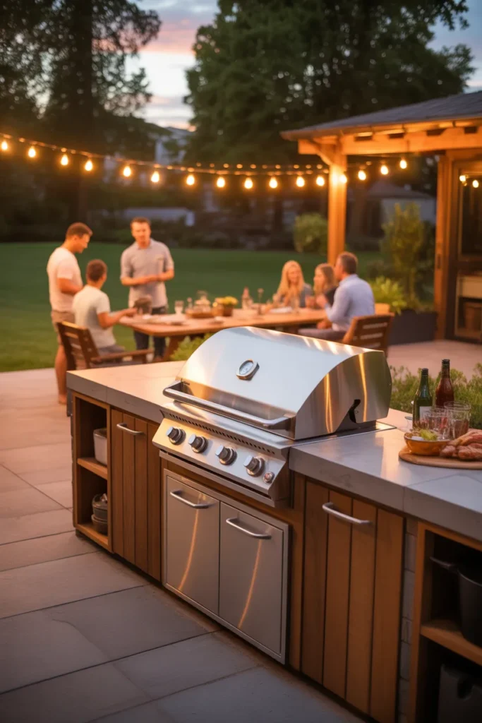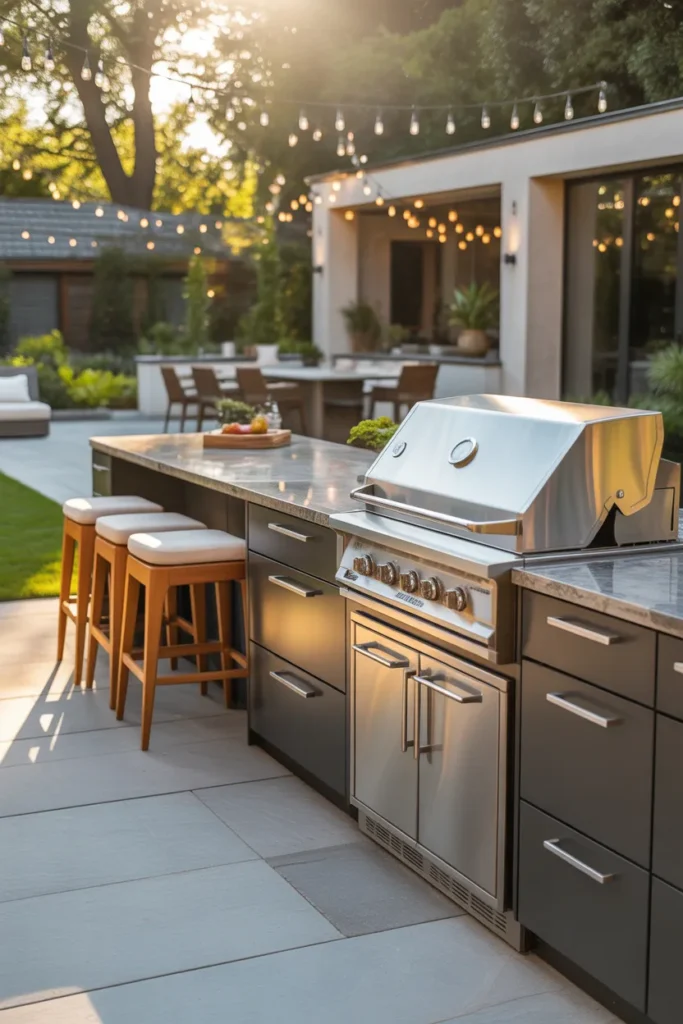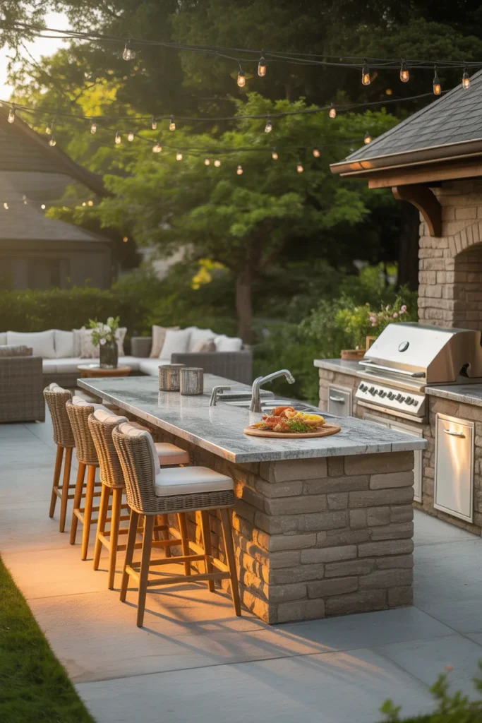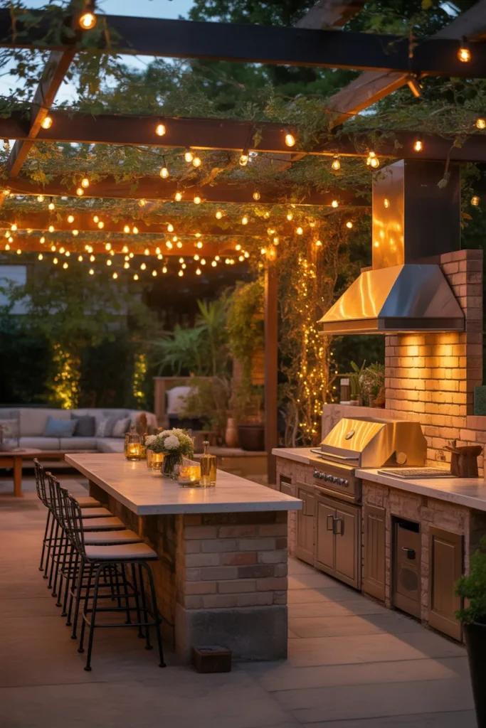 String lights add a magical touch to your outdoor kitchen, especially in the evening. They create a warm and inviting atmosphere for guests to relax and enjoy. This simple addition can transform the entire mood of your space. It’s ideal for intimate summer nights and celebrations.