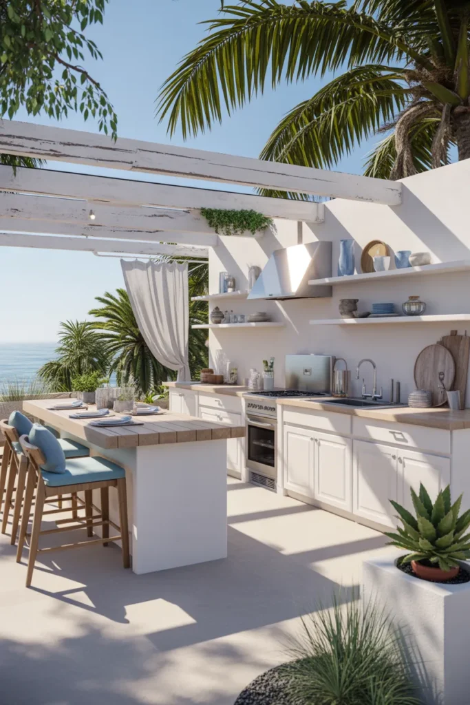 A coastal outdoor kitchen uses light colors and breezy elements to create a fresh look. Blue and white tones combined with natural textures reflect a beachside vibe. This design feels open, bright, and relaxing. It’s perfect for creating a calm and refreshing summer gathering space.