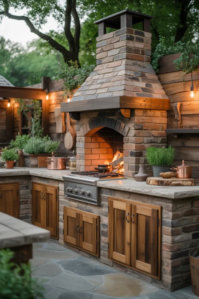 Rustic outdoor kitchens bring warmth and character through natural wood and stone elements. A wood-fired oven becomes the centerpiece, perfect for homemade pizzas and gatherings. The earthy tones create a welcoming environment that feels both cozy and timeless. It’s ideal for relaxed summer evenings with family and friends.