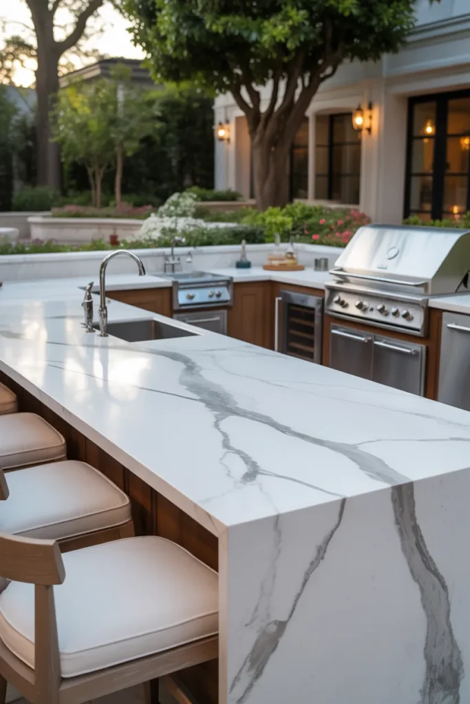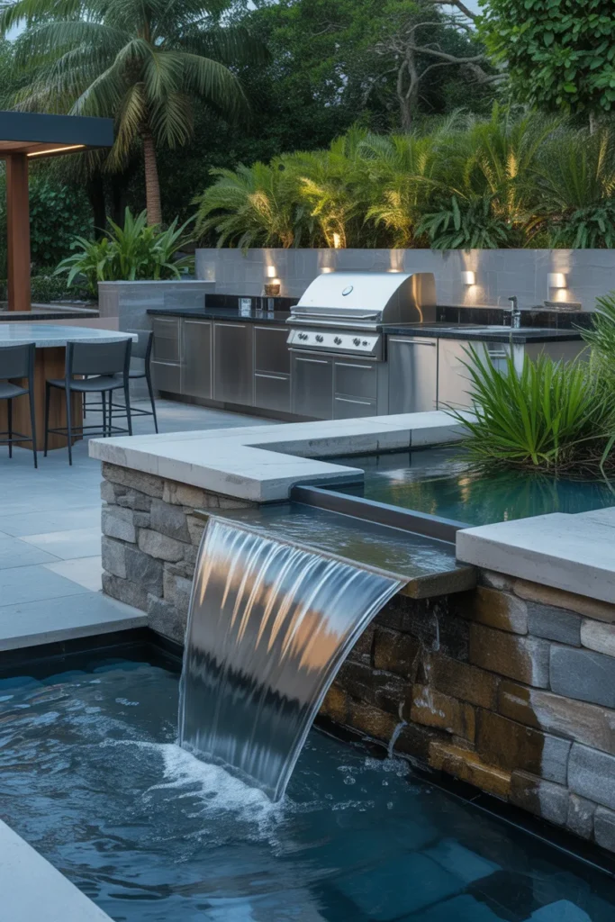 Adding a water feature brings a sense of tranquility to your outdoor kitchen. The soothing sound of water enhances relaxation while entertaining guests. It also adds a touch of luxury and uniqueness to your design. This setup creates a peaceful yet stylish environment for summer gatherings.