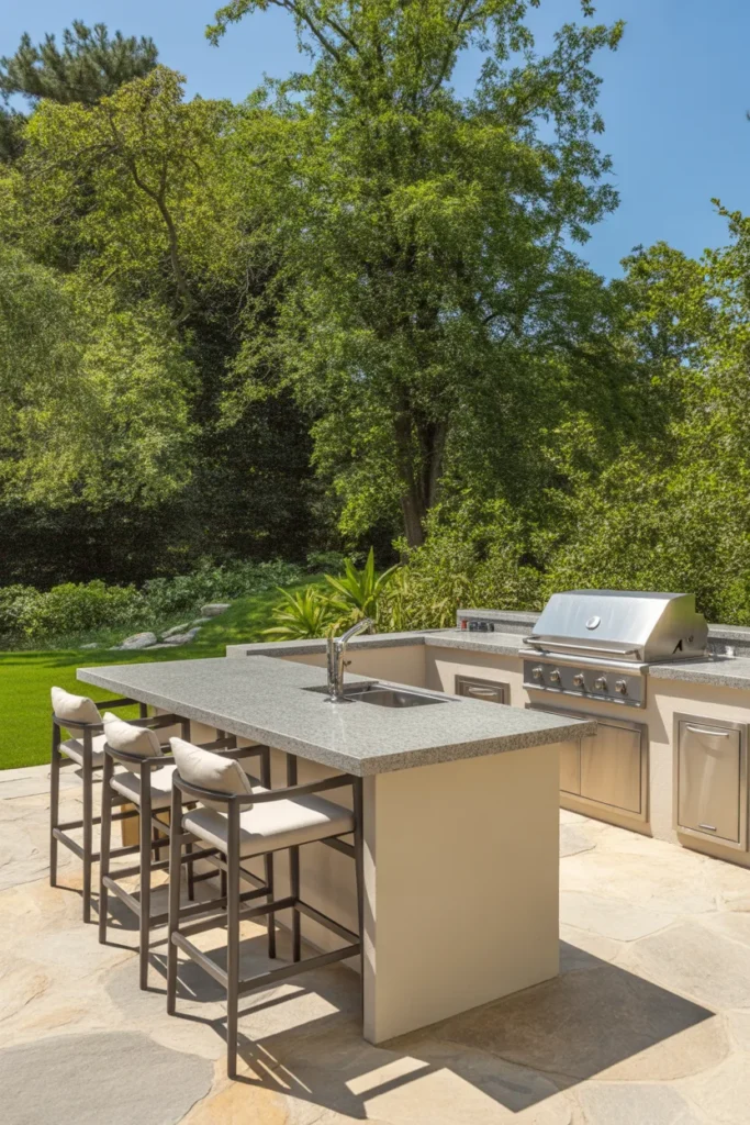 A breakfast bar creates a casual and social atmosphere in your outdoor kitchen. Guests can sit, chat, and enjoy quick meals or drinks. It makes the space feel more interactive and welcoming. This setup works perfectly for relaxed summer mornings and evening hangouts.