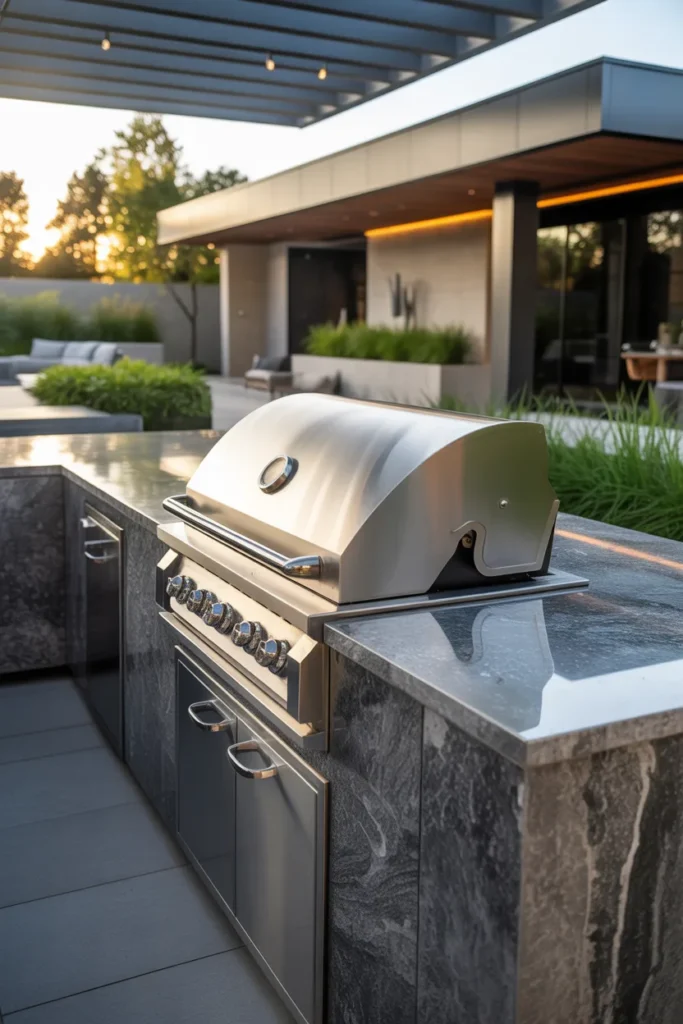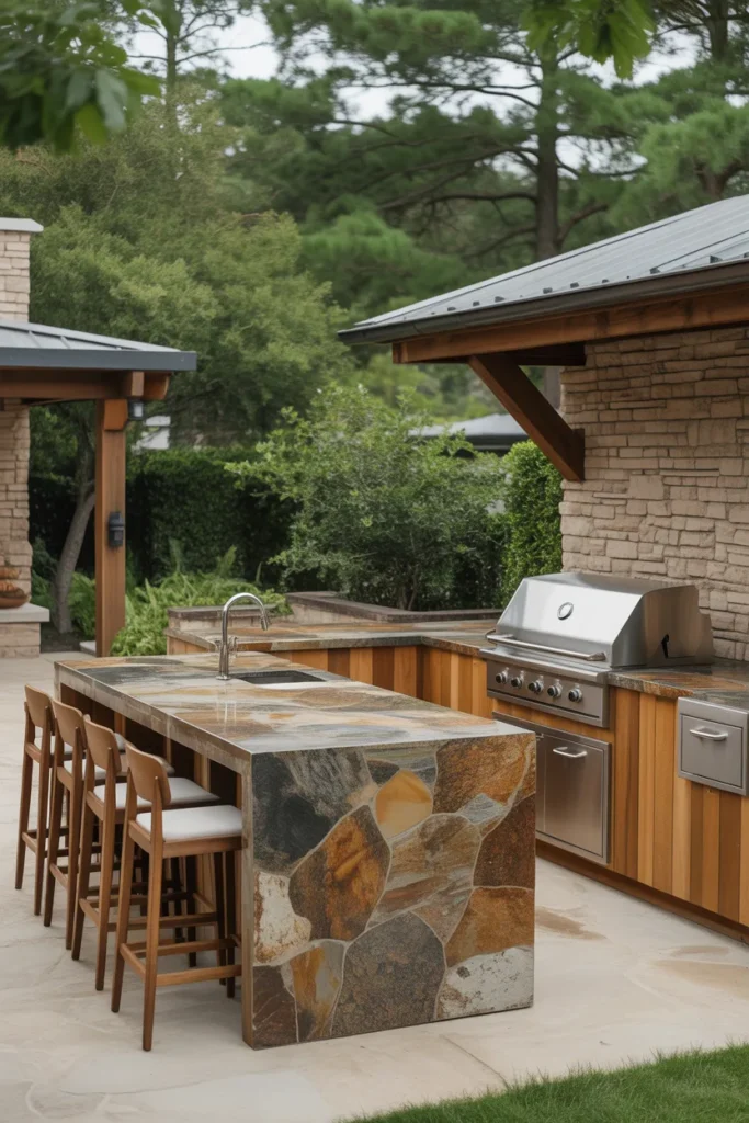 Stone finishes add durability and a natural charm to your outdoor kitchen. The texture and color variations create visual interest and warmth. This design blends well with outdoor surroundings. It’s a timeless choice that works for both rustic and modern styles.
