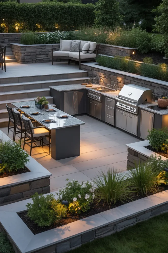 A multi-level layout helps organize your outdoor kitchen into different functional zones. Cooking, dining, and relaxing areas can be clearly defined. This improves flow and makes the space more efficient during gatherings. It’s ideal for larger backyards and frequent hosting.