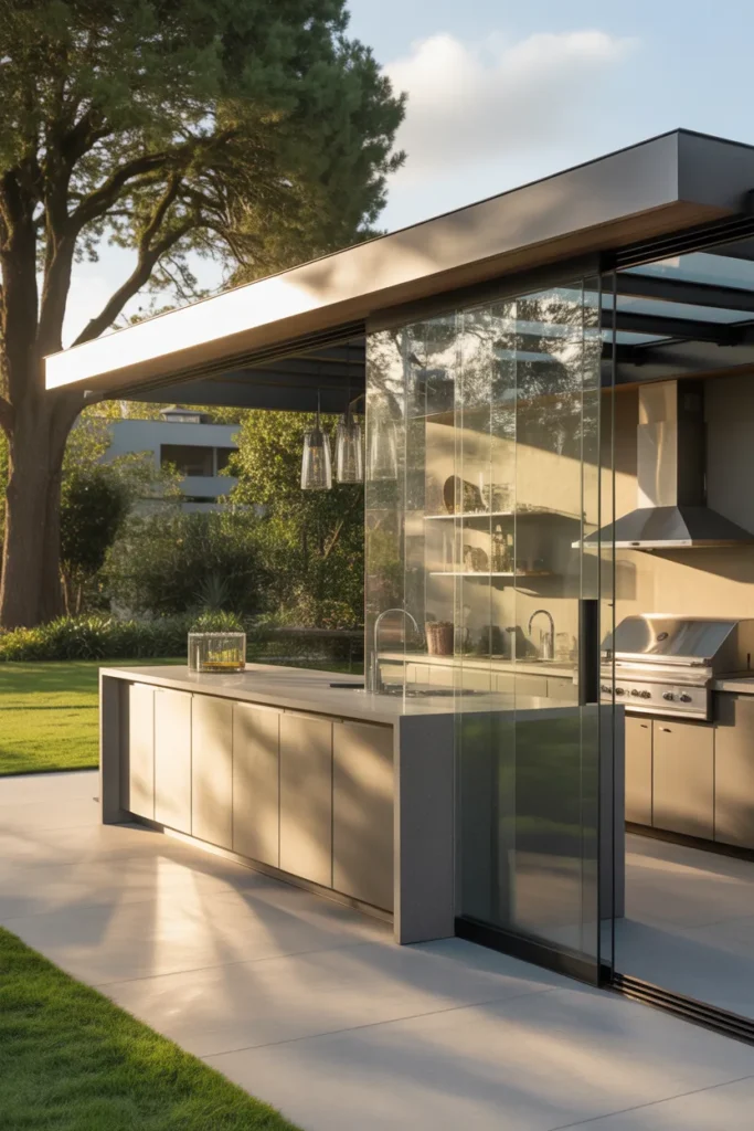 Glass elements bring a sleek and modern touch to your outdoor kitchen. They reflect light beautifully and create an open, airy feel. This design works well for contemporary spaces. It adds a sense of sophistication while maintaining a connection with the outdoors.