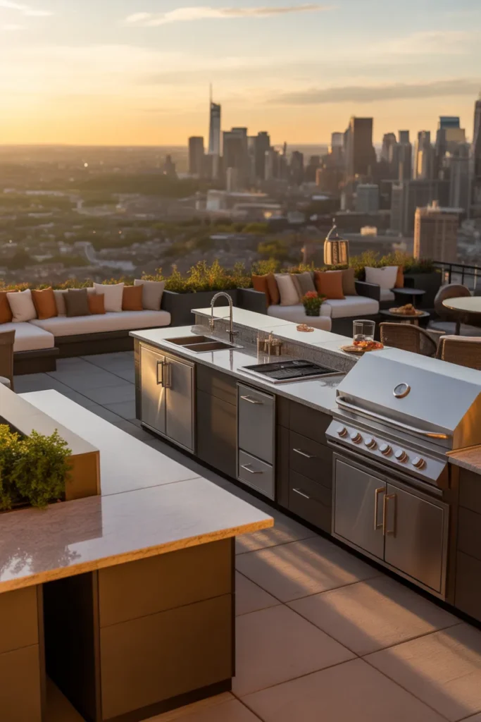 A rooftop outdoor kitchen offers stunning views and a unique entertaining experience. It transforms unused space into a stylish and functional area. With the right seating and lighting, it becomes perfect for evening gatherings. This setup adds a luxurious urban touch to your home.