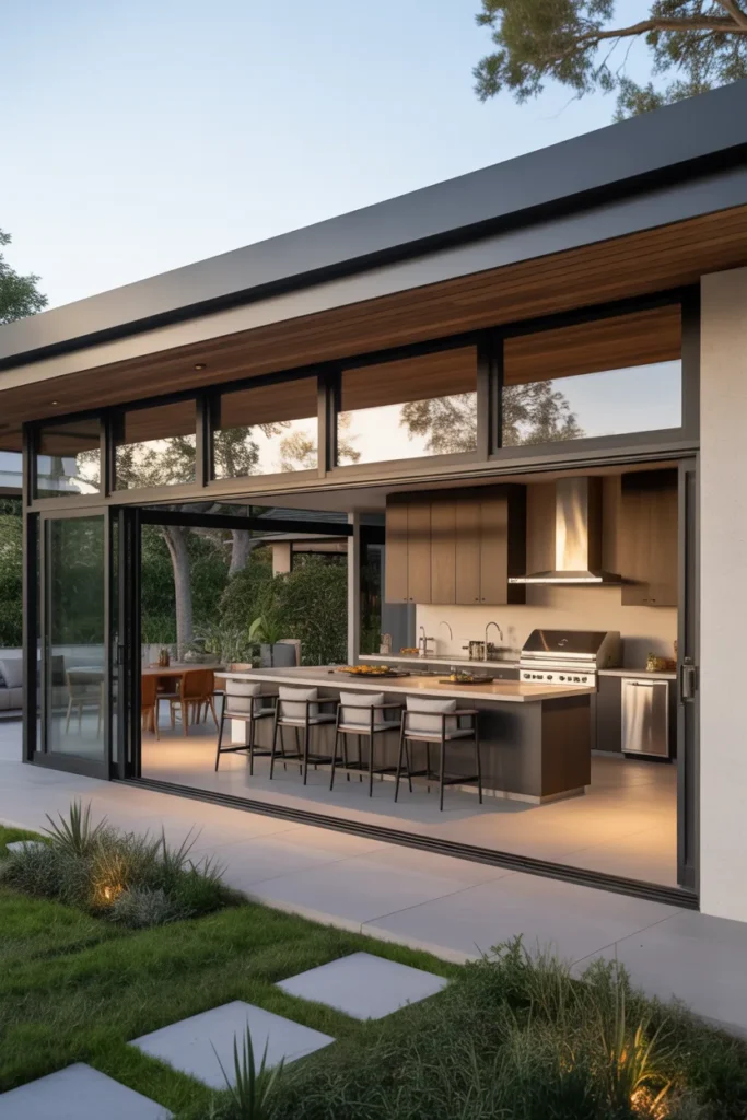 Sliding glass doors create a seamless connection between indoor and outdoor spaces. This design allows easy movement and enhances natural light. It makes your outdoor kitchen feel like an extension of your home. Perfect for hosting large gatherings with ease.