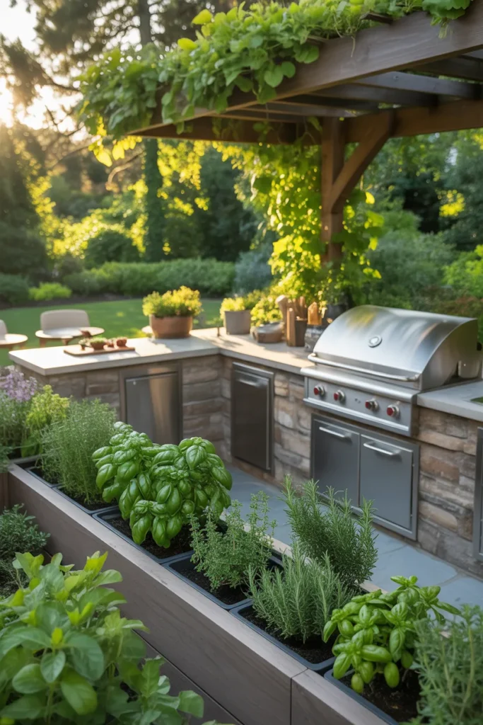 Adding a herb garden to your outdoor kitchen brings freshness and convenience. You can pick herbs right while cooking, enhancing flavor instantly. It also adds greenery and beauty to your setup. This idea is perfect for food lovers and gardening enthusiasts.