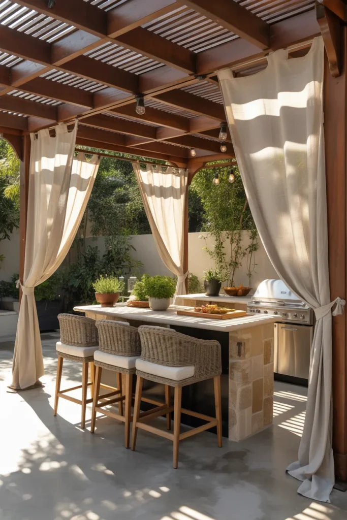 Pergola curtains add privacy and elegance to your outdoor kitchen. They provide shade while creating a soft and inviting atmosphere. The flowing fabric enhances the overall aesthetic. This setup is perfect for stylish and comfortable summer gatherings.