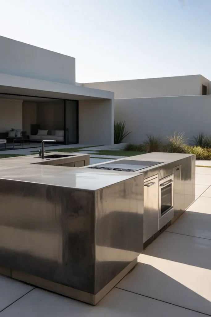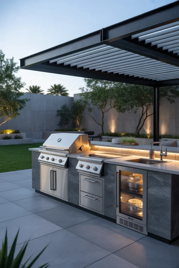 Industrial outdoor kitchens feature bold materials like metal and concrete for a modern edge. This design is both durable and visually striking, making it stand out. The raw textures give a contemporary urban feel to your space. It’s ideal for those who prefer a sleek and unique look.
