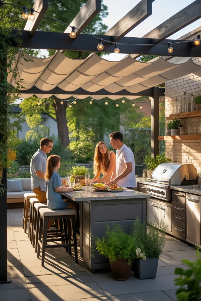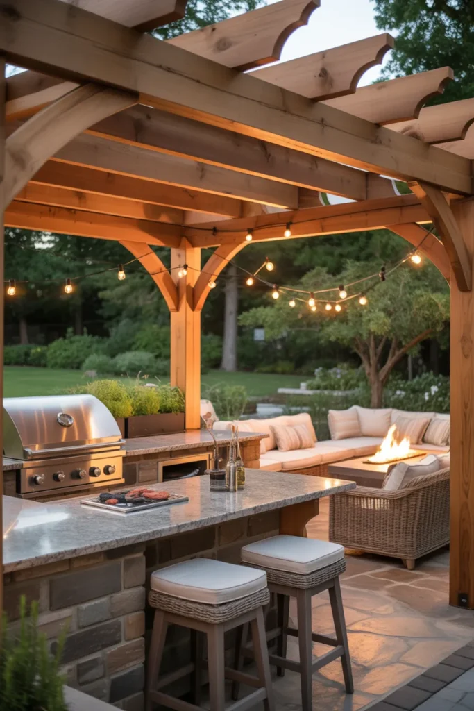 A pergola adds both style and comfort by providing shade during sunny days. It defines the kitchen area while creating a cozy atmosphere for gatherings. You can enhance it with hanging lights or plants for extra charm. This design keeps your cooking space cool and inviting.