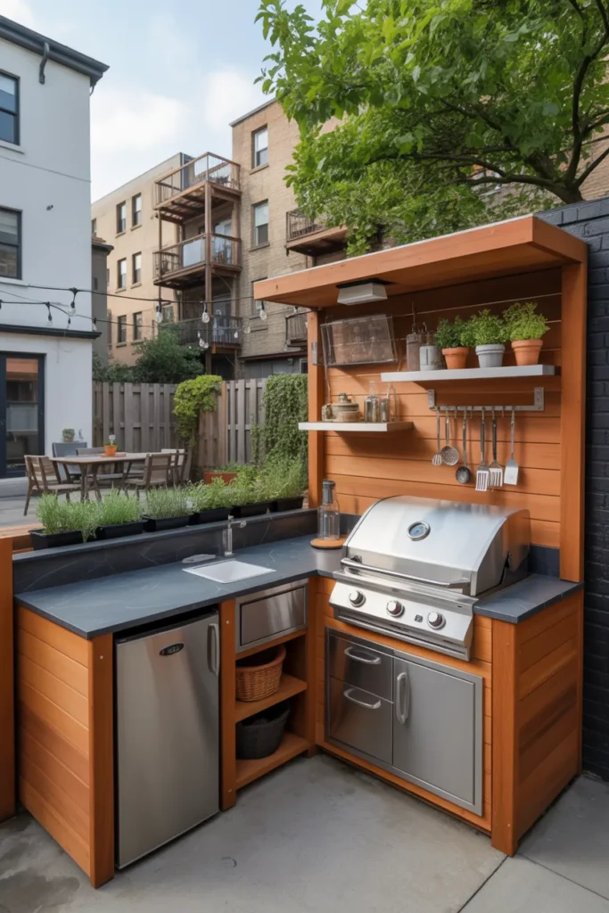 Even a small backyard can host a functional outdoor kitchen with the right layout. Smart storage solutions and compact appliances maximize every inch of space. This design proves you don’t need a large area to entertain guests comfortably. It’s perfect for city homes or cozy patios.