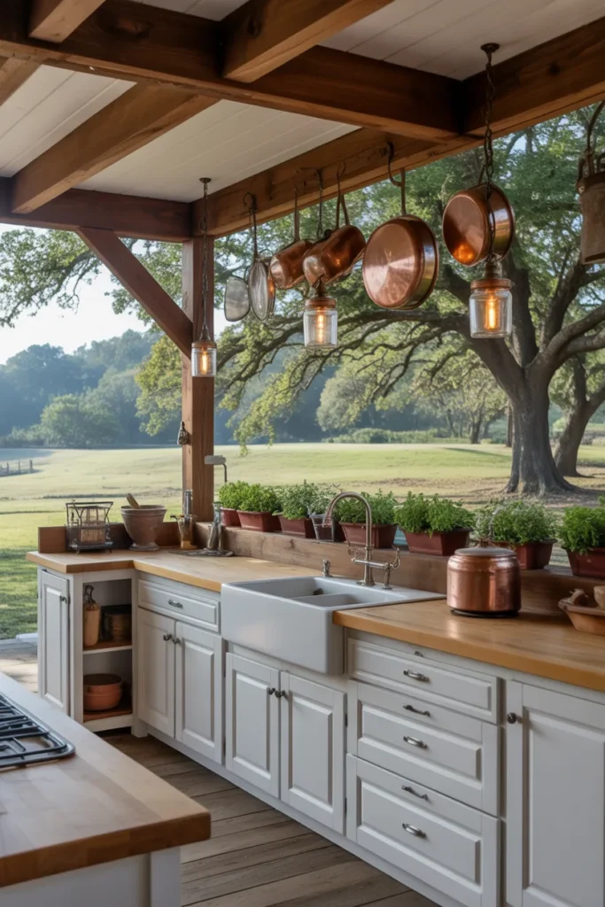 Farmhouse outdoor kitchens combine rustic charm with a clean and airy aesthetic. White cabinetry paired with wooden accents creates a warm yet fresh look. This style is perfect for those who love a blend of traditional and modern elements. It makes summer gatherings feel relaxed and welcoming.