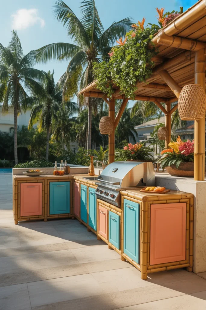 A tropical outdoor kitchen creates a vacation-like atmosphere right at home. Natural materials like bamboo and vibrant colors add energy and freshness. Surrounding the space with greenery enhances the island vibe. It’s perfect for fun, lively summer gatherings.