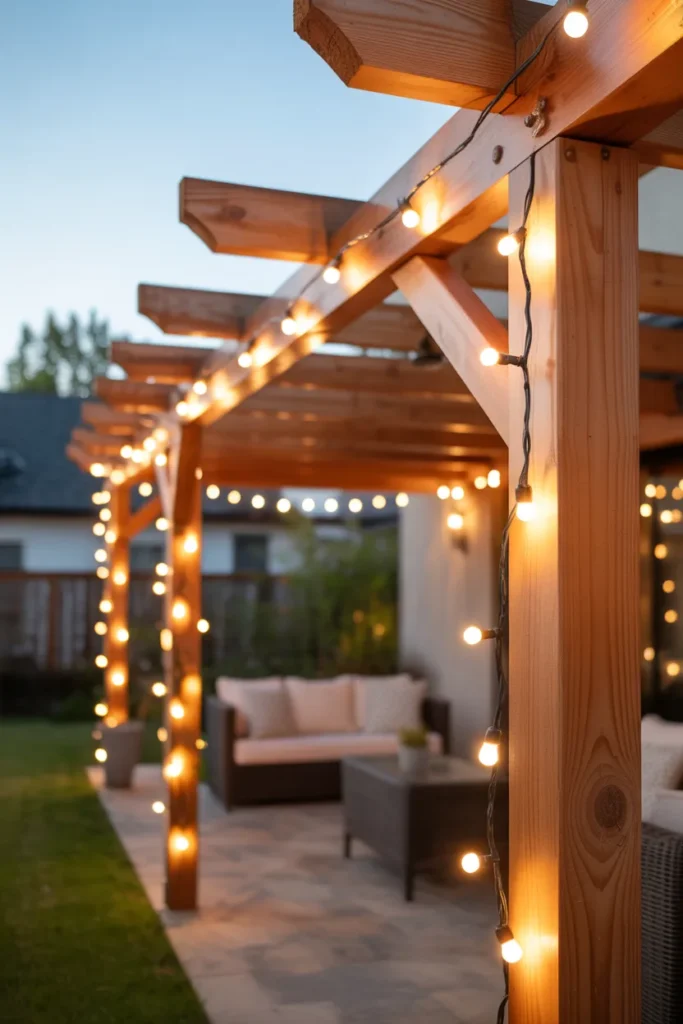 Soft string lights hung across wooden beams instantly create a welcoming and intimate patio atmosphere. The warm glow gently illuminates the space without overpowering it, making it perfect for evening relaxation. This idea works beautifully with rustic or modern outdoor setups. It’s simple yet incredibly effective for transforming your patio into a cozy retreat.
